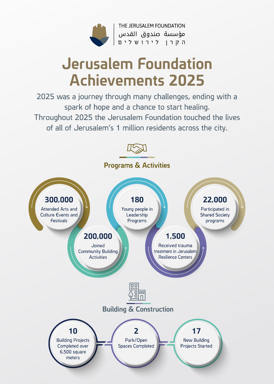 This past year we continued to deal with the challenges of war, the longest Israel has known, yet thankfully the year ends on a hopeful note and the prospect of beginning to heal. Under these conditions, the Jerusalem Foundation has continued its programming, promoting the goals and values which are at its core and responding to changing needs on the ground and urgent needs. We celebrate this year as one in which we’ve raised more funds than ever before, which have gone toward programs and projects spanning creative culture, shared society, trauma recovery, community cohesion and resilience and leadership development, as well as creating open spaces for Jerusalem’s residents and building centers that provide for the city’s communities, across all religions, cultures, backgrounds and neighborhoods that make up Jerusalem.