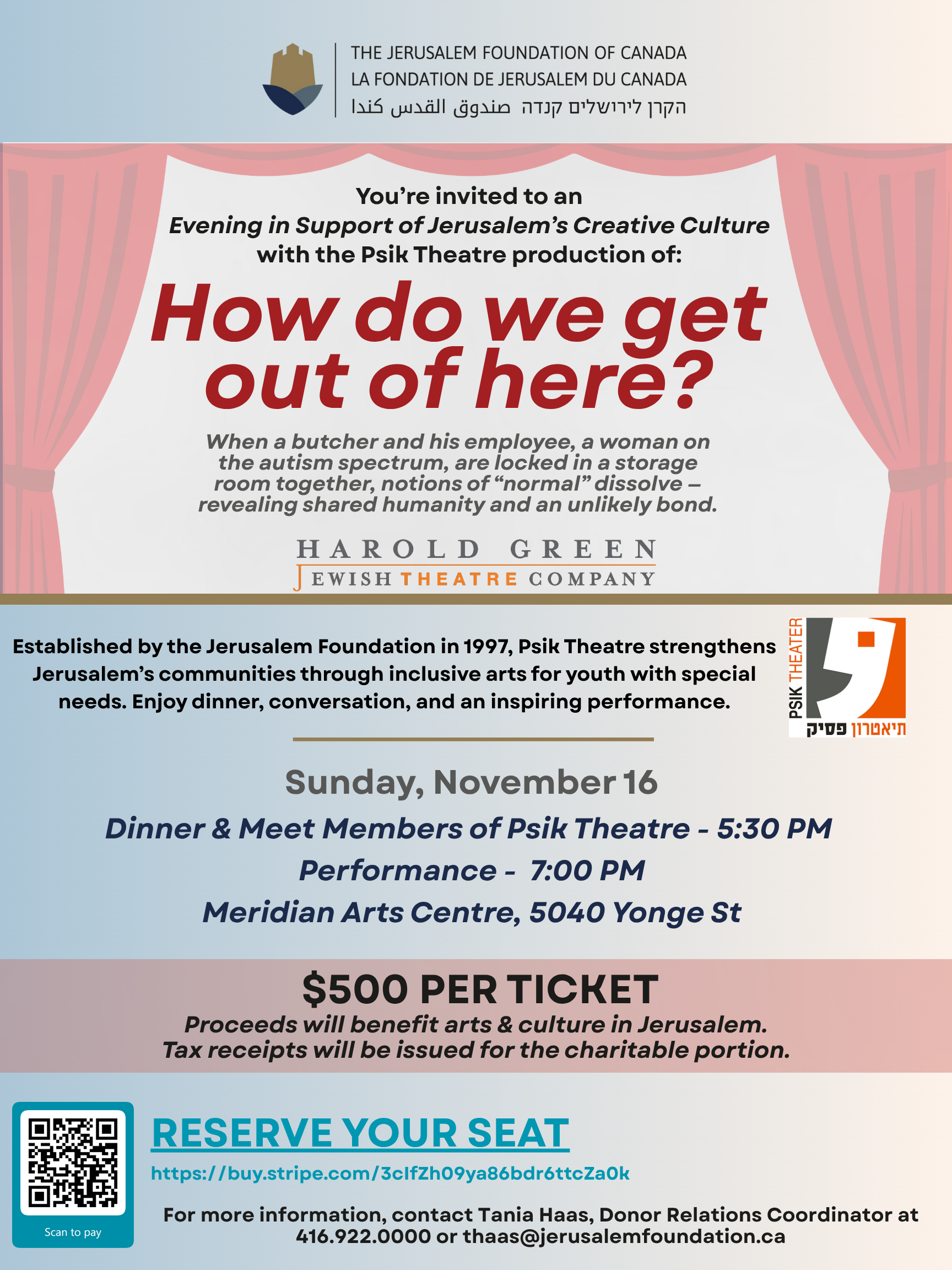 Psik (Comma) Theatre was founded in Jerusalem in 1997, by graduates of the Nissan Nativ Acting Studio, to create original theatre based on contemporary themes in Israeli culture. The theatre troupe performs its repertoire for children, teens and adults, and undertakes special theatre projects for people with disabilities, new immigrants and at-risk youth. With the aim of making theatre accessible for everyone, it performs around Jerusalem as well ‘at home’ at its own performance centre. The company has performed at festivals throughout Israel and in Europe. They have been invited by the Harold Green Jewish Theatre Company of Toronto to preform “How do we get out of here” in November 2025.